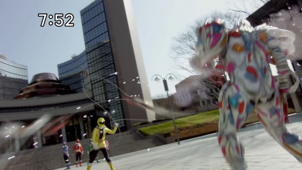 Then as Boukenyellow she uses Boukenyellow's Bucket Scoopers to punch the action commander into the sky, defeating him for now.